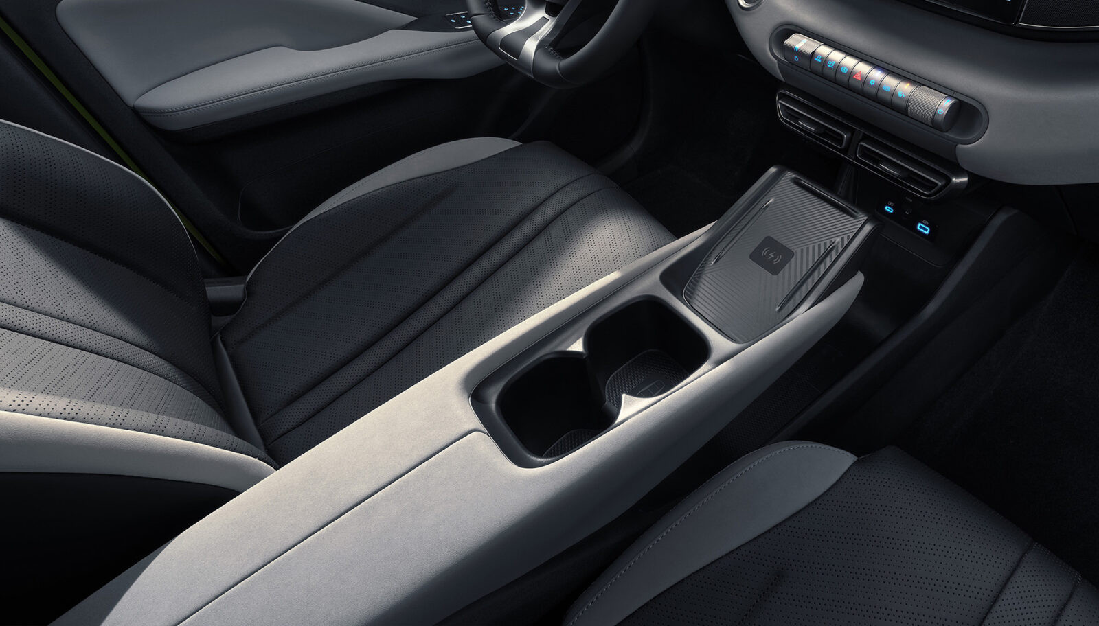 Wloty powietrza z charakterystycznymi, ostrymi liniami inspirowanymi stylem cyberpunk nadają wnętrzu DOLPHIN SURF zdecydowanego, technologicznego charakteru. To połączenie funkcjonalności z nowoczesnym designem, które świetnie pasuje do miejskiego auta elektrycznego.