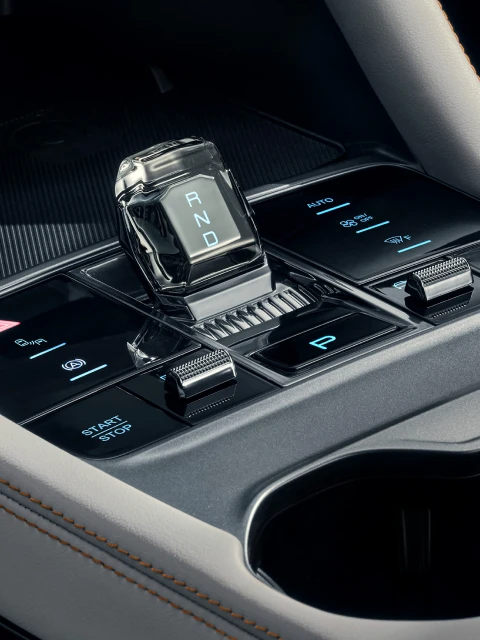 Wzrok przyciąga dźwignia zmiany biegów o formie kryształu, inspirowana strukturą wody. Otaczają ją wygodnie rozmieszczone przyciski odpowiedzialne m.in. za tryby jazdy i ustawienia rekuperacji. To połączenie wysokiej estetyki z intuicyjną obsługą.